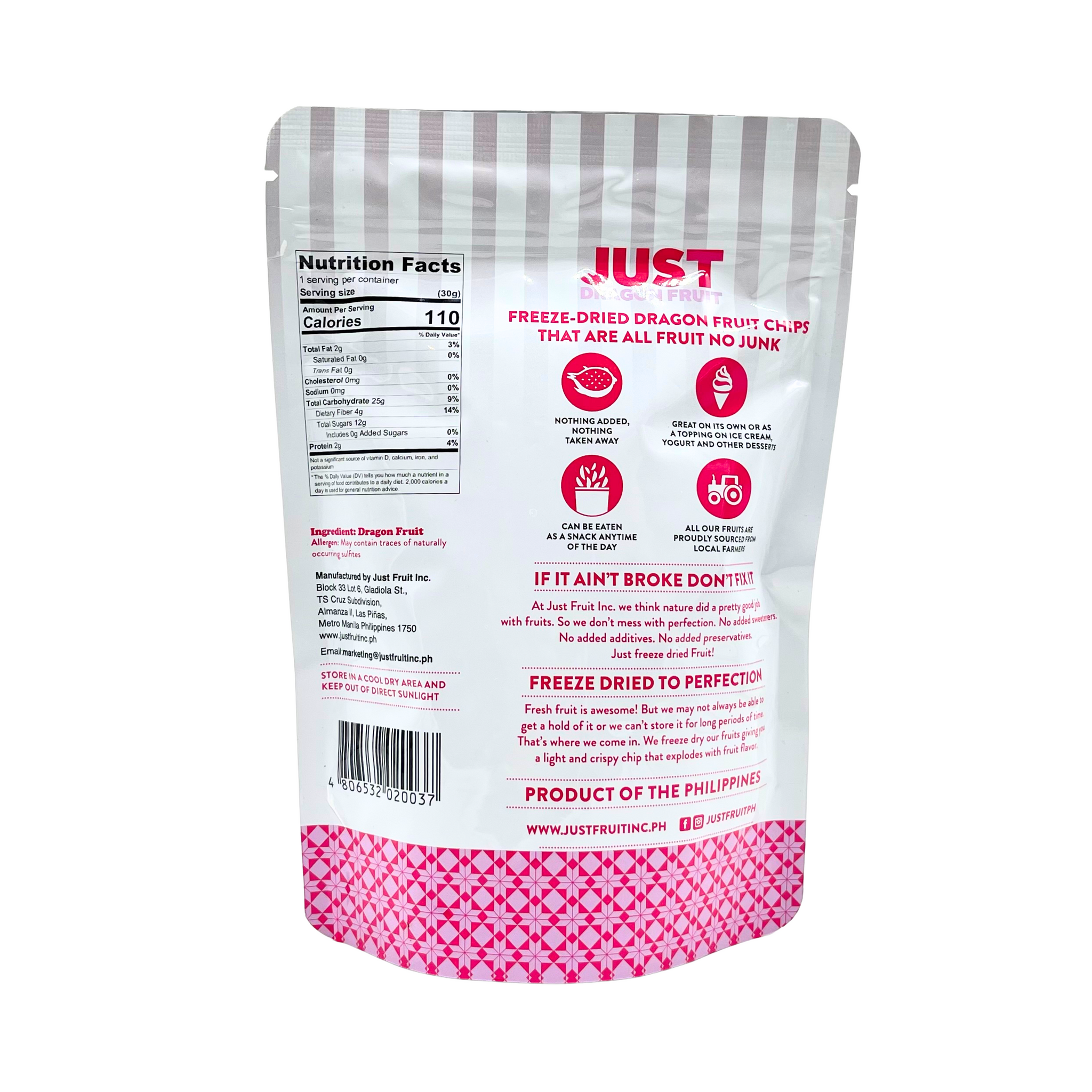 Snack bright with Just Fruit’s Dragon Fruit Chip Snacks — a bold, beautiful burst of 100% real dragon fruit in every crisp bite. We freeze-dry our fruits at peak ripeness, locking in all the nutrients and natural sweetness, giving you a light, crunchy chip that’s as nutritious as it is delicious – our fruits are proudly sourced from local farmers in the Philippines.