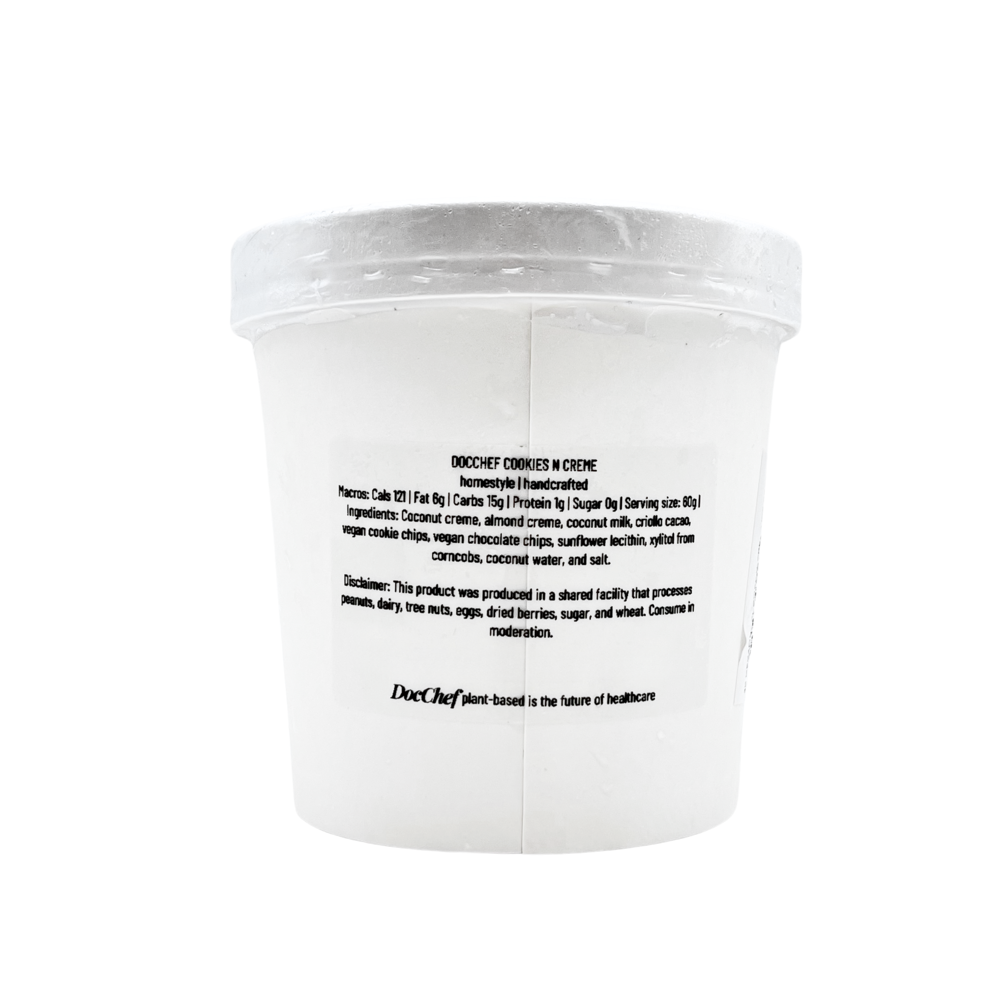 Doc Chef – Cookies N’ Cream is a rich, plant-based ice cream made for indulgence without dairy. Crafted with coconut milk, almond creme, and vegan cookie and chocolate chips, it delivers a creamy texture and classic cookies-and-cream flavor. Perfect for those seeking a vegan-friendly treat that’s both delicious and wholesome.