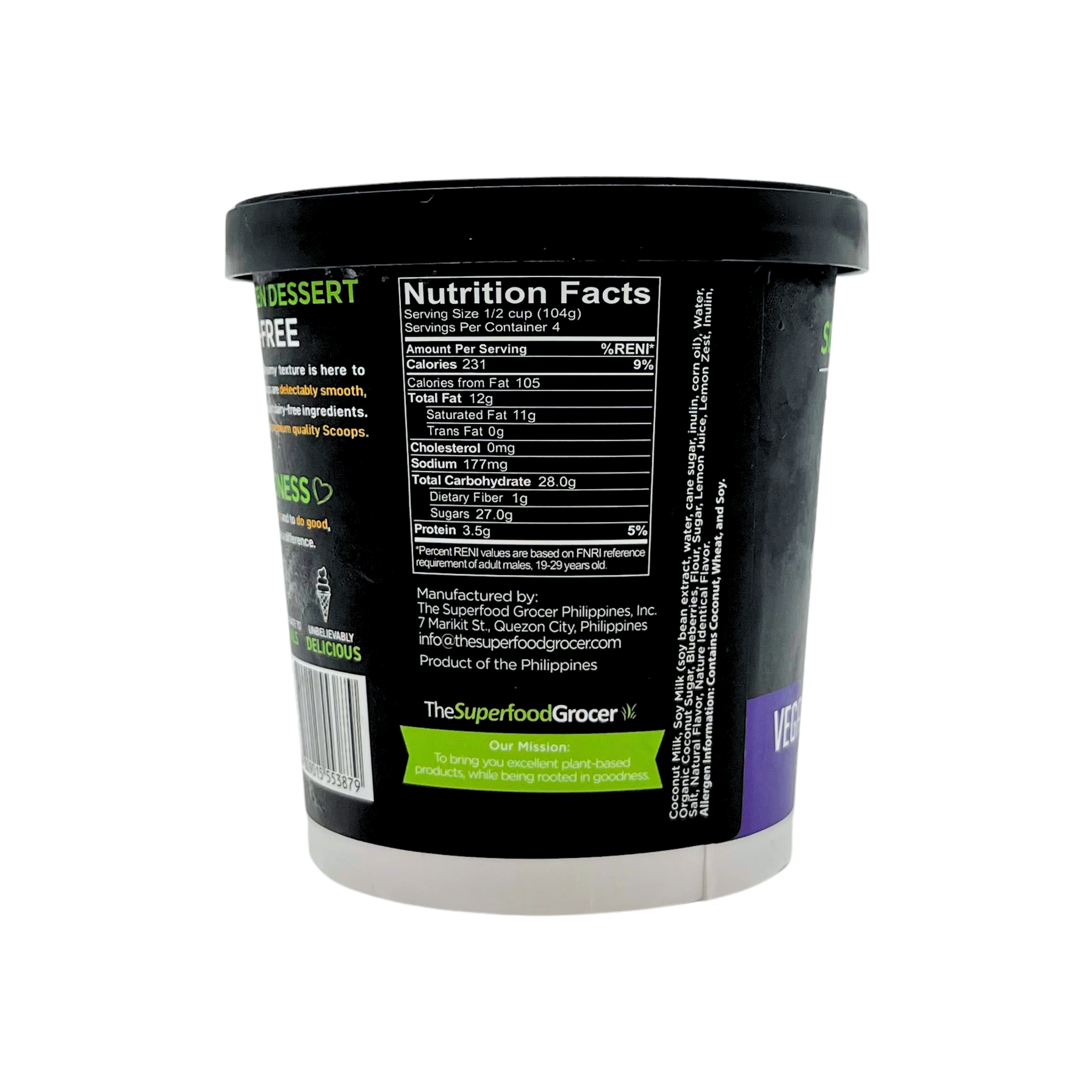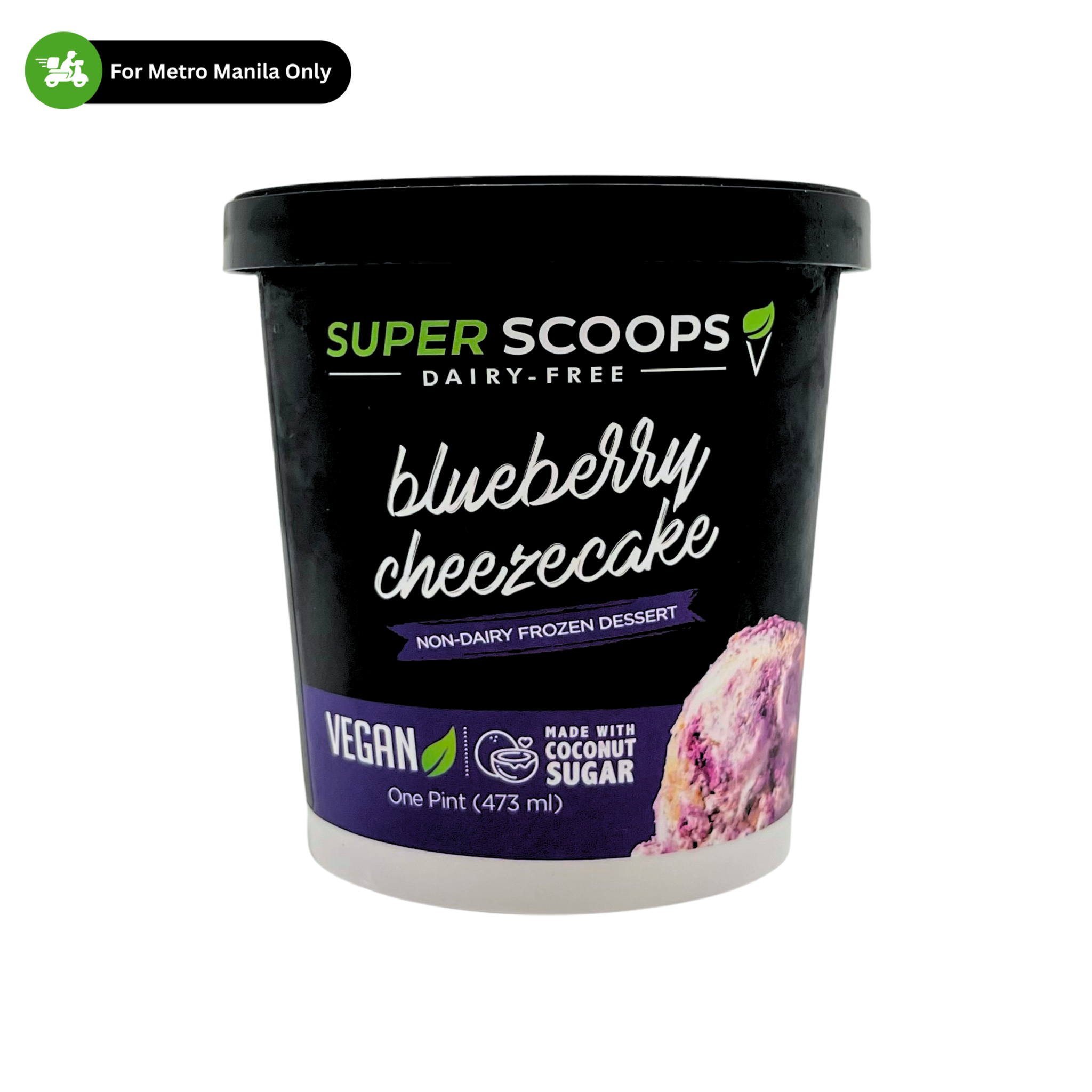 SuperScoops - Blueberry Cheezecake Vegan Ice Cream is a creamy, 100% plant-based indulgence churned with fresh blueberries and topped with a vegan cheesecake crust. Made with coconut milk, soy milk, organic coconut sugar, and natural flavors, this guilt-free treat proudly supports local Filipino coconut farmers—every scoop as wholesome as it is delicious.