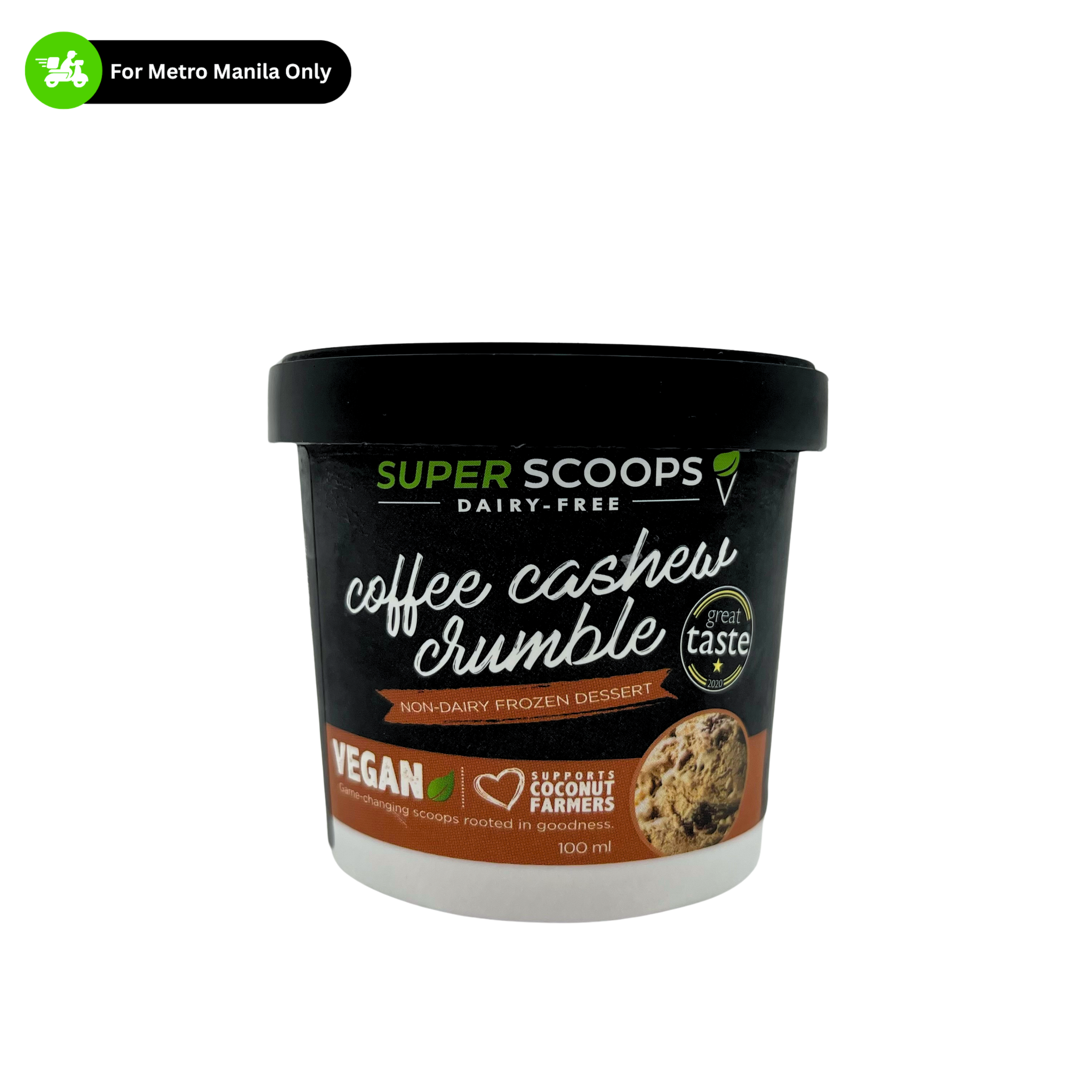 SuperScoops - Coffee Cashew Crumble Vegan Ice Cream delivers a bold coffee kick balanced with creamy cashews and rich, gluten-free brownie crumbles for the perfect blend of smooth and crunchy. Made with coconut and soy milk and naturally sweetened, this 100% plant-based, dairy-free treat is as satisfying as it is guilt-free while proudly supporting local Filipino coconut farmers.