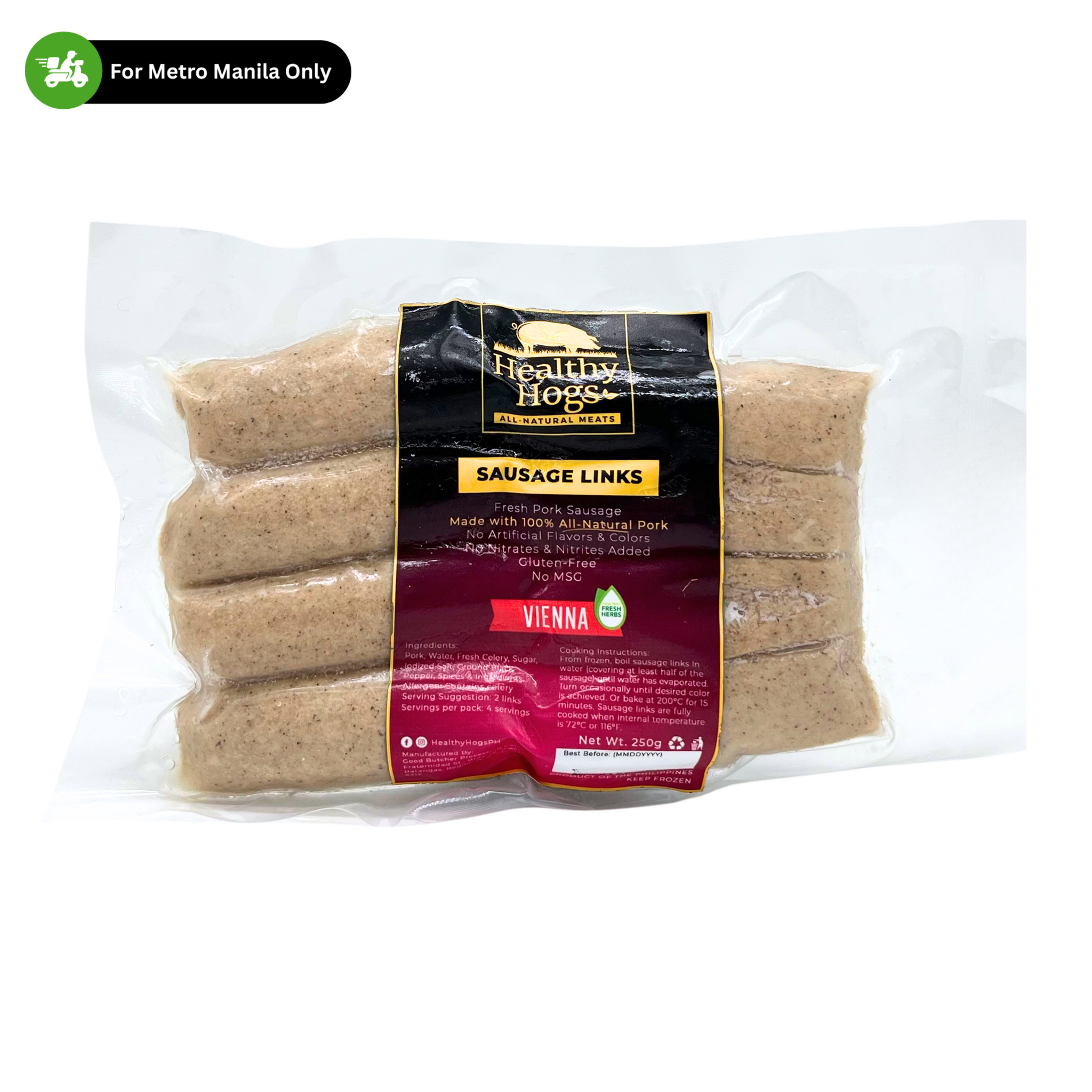 Enjoy a timeless favorite made the right way with Healthy Hogs – Vienna Sausage Links. Crafted from 100% all-natural pork, these sausages deliver that familiar, mild flavor in every tender, juicy bite — without any of the unnecessary additives.