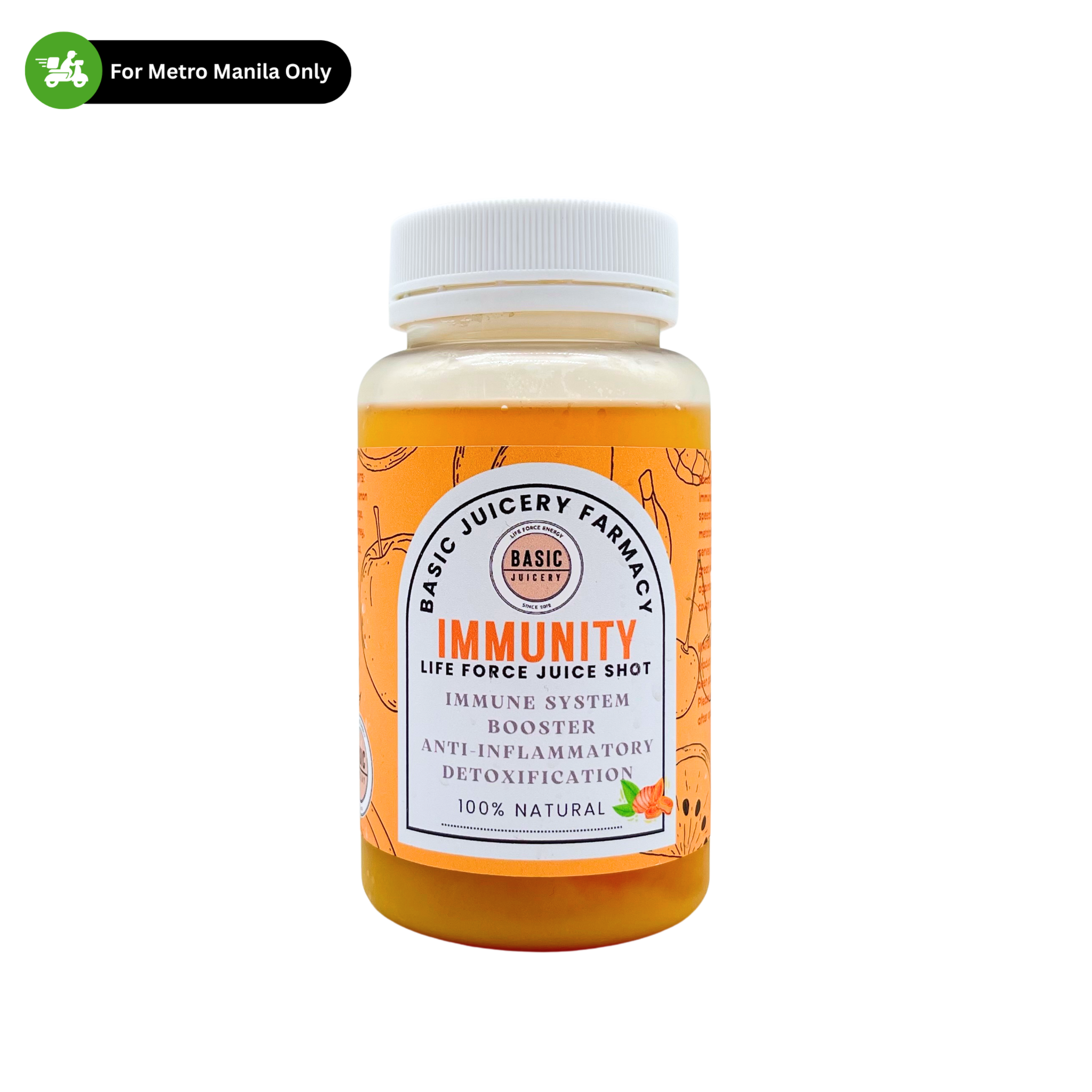 Basic Juicery – Immunity is a cold-pressed wellness juice shot crafted to boost the immune system, reduce inflammation, and support detoxification. Made with turmeric, lemon juice, orange, ginger, honey, lemongrass, and sambong turmeric, it helps strengthen the body’s defenses, speed up metabolism, and provide natural protection against colds, coughs, and flu. Stay healthy starting with nourishing your body from within.