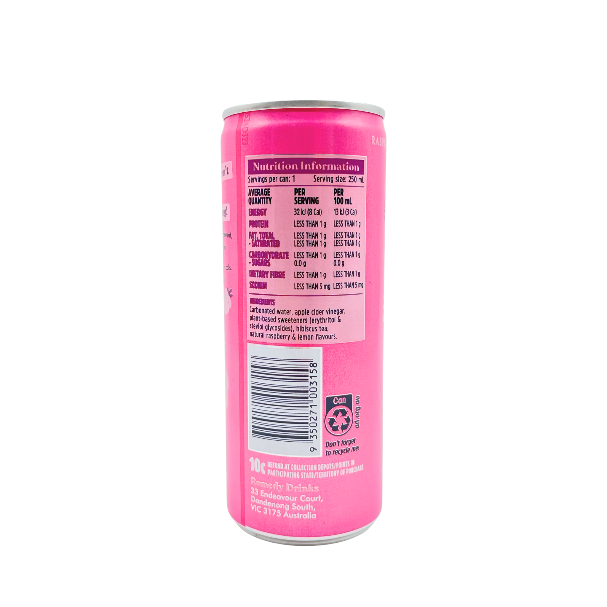 Ingredients: Carbonated water, apple cider vinegar, plant-based sweeteners (erythritol & steviol glycosides), hibiscus tea, raspberry & lemon flavors.