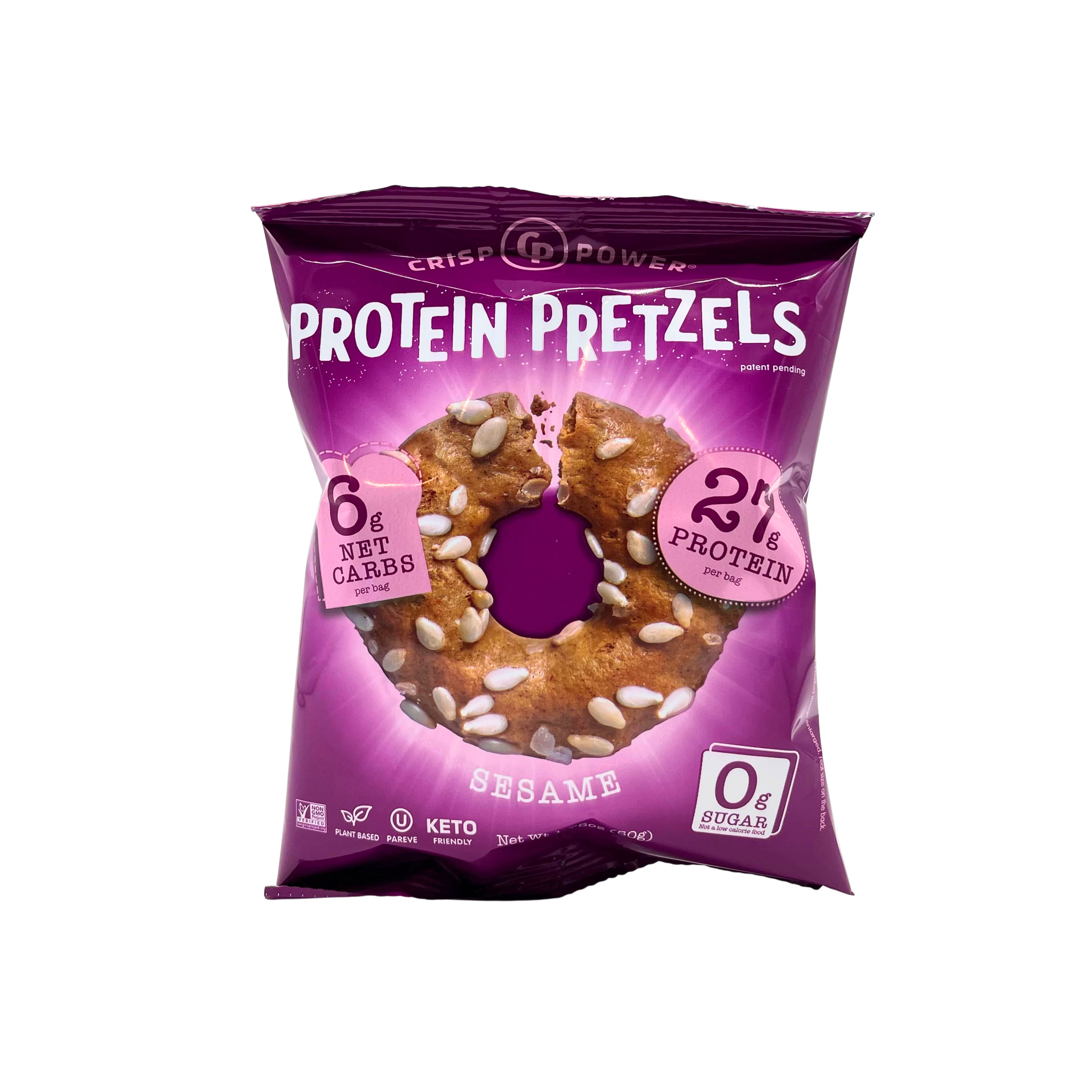 Nutty, toasty, and crunchy! If you’re craving a savory snack, better try Crisp Power - Sesame Protein Pretzels. It’s high in protein with 27g of plant‑based protein per bag, enough fuel to power your day. Low Net Carbs with just 6g net carbs per bag, designed with keto and low‑carb lifestyles in mind, and high in fiber with 10g of dietary fiber per bag - delivering about 36% of your recommended daily fiber intake per serving.