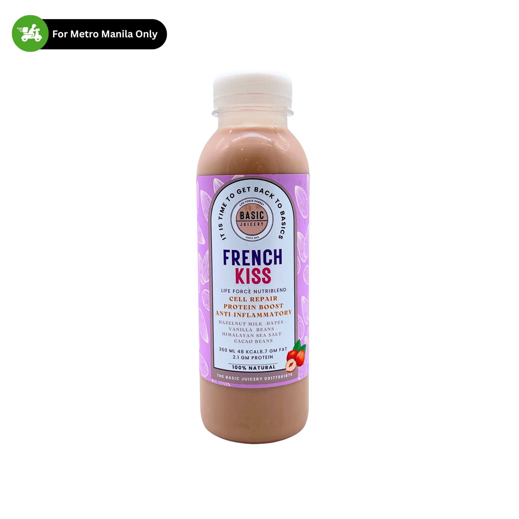 Basic Juicery – French Kiss is a 100% natural juice designed to support cell repair, boost protein, and provide anti-inflammatory benefits. Made with creamy hazelnut milk, sweet dates, aromatic vanilla beans, cacao beans, and a touch of Himalayan sea salt, it delivers a rich and nourishing flavor. Each bottle contains 2.1g of protein with no added sugars or preservatives.