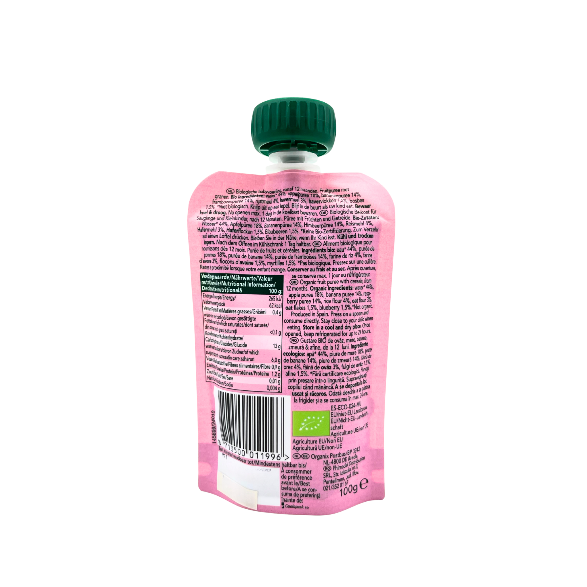 Ingredients: Water* (44%), Apple Puree (18%), Banana Puree (14%), Raspberry Puree (14%), Rice Flour (4%), Oat Flour (3%), Oat Flakes (1.5%), Blueberry (1.5%)