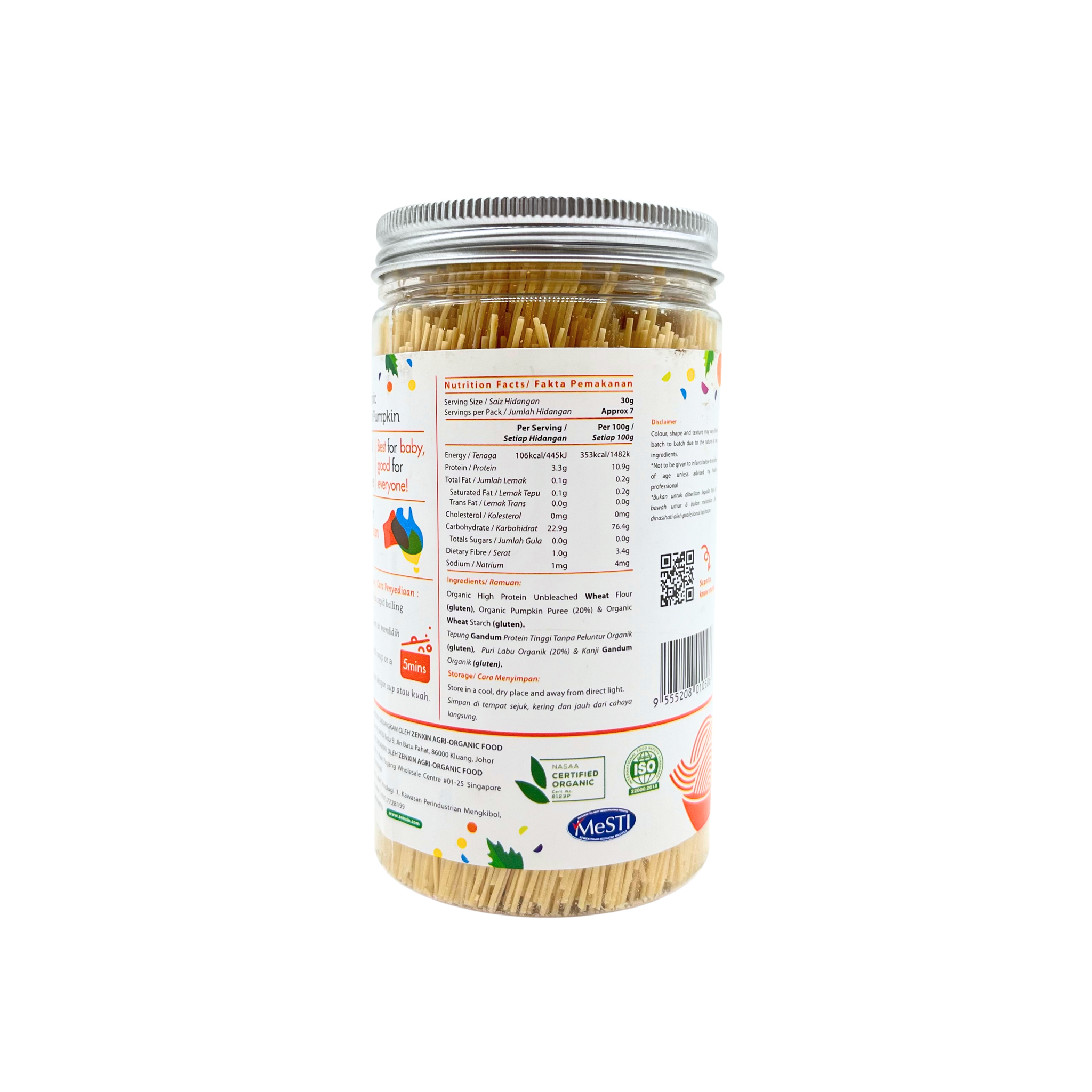 Made of high quality certified organic unbleached flour from Australia and organically grown fresh vegetables. Guaranteed to be free from artificial coloring and flavoring, the noodles exude bright colors due to the presence of a high percentage (20%) of organic vegetable puree. The brighter the color, the higher the nutritional value. No added sugar, salt, or MSG. Free from harmful chemical fertilisers, pesticides and additives, these thin noodles are wholesome choices for your little ones!