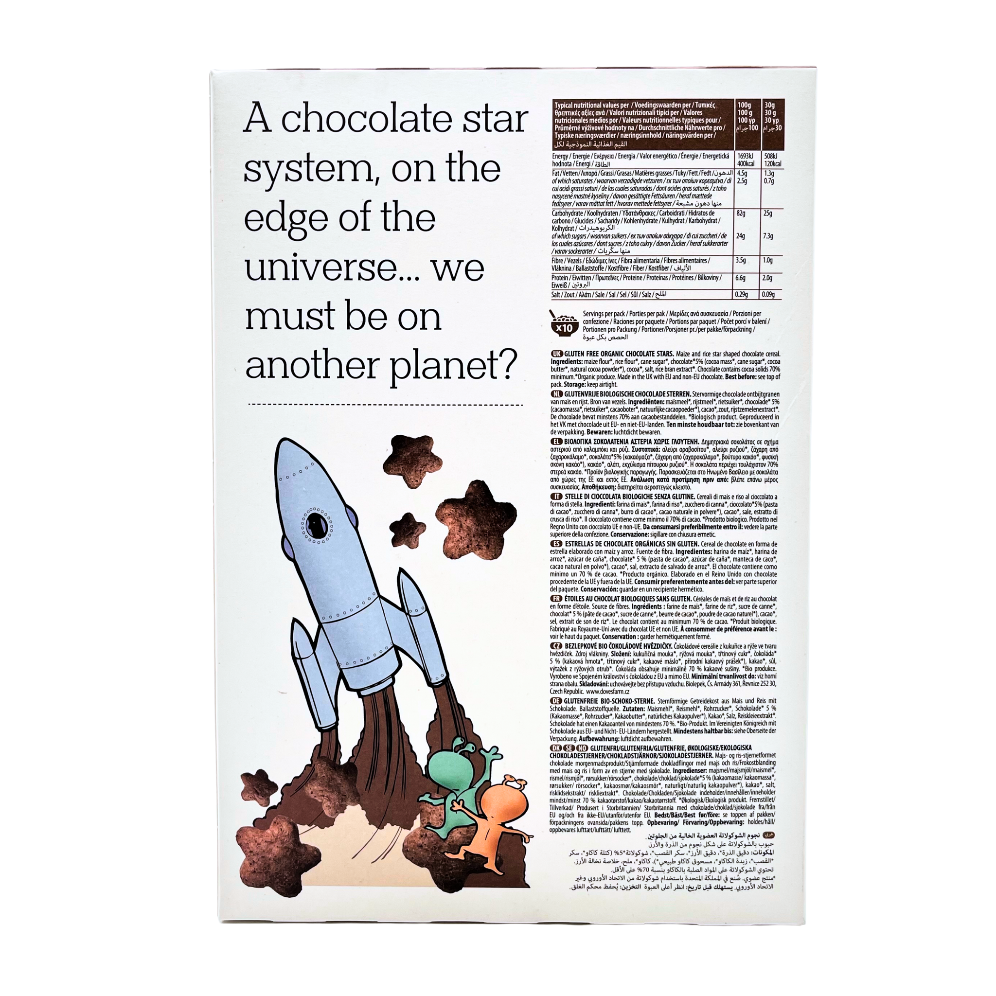 Ingredients: Organic Maize Flour, Organic Rice Flour, Organic Cane Sugar, Organic Chocolate (5%) (Organic Cocoa Mass, Organic Cane Sugar, Organic Cocoa Butter, Natural Cocoa Powder), Organic Cocoa, Salt, Organic Rice Bran Extract