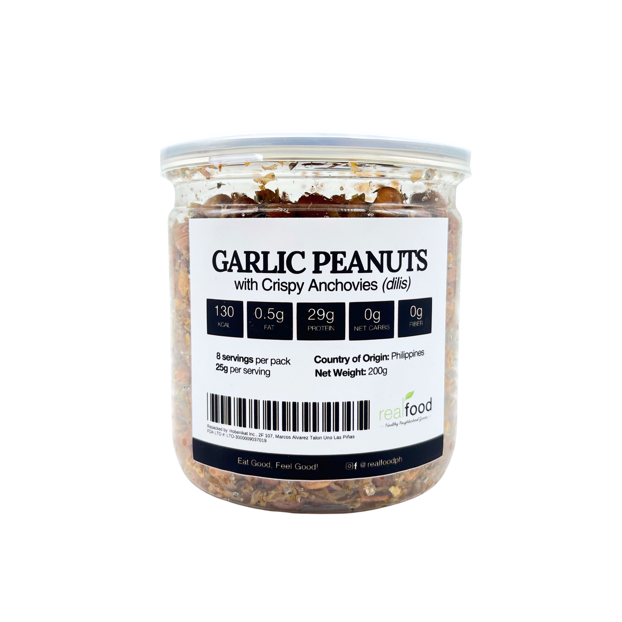 Real Food - Garlic Peanuts with Anchovies are crunchy roasted peanuts flavored with rich garlic seasoning and dried anchovies for a bold, salty kick. Locally made in the Philippines, this snack gives that crispy, aromatic, and umami taste experience in every bite.