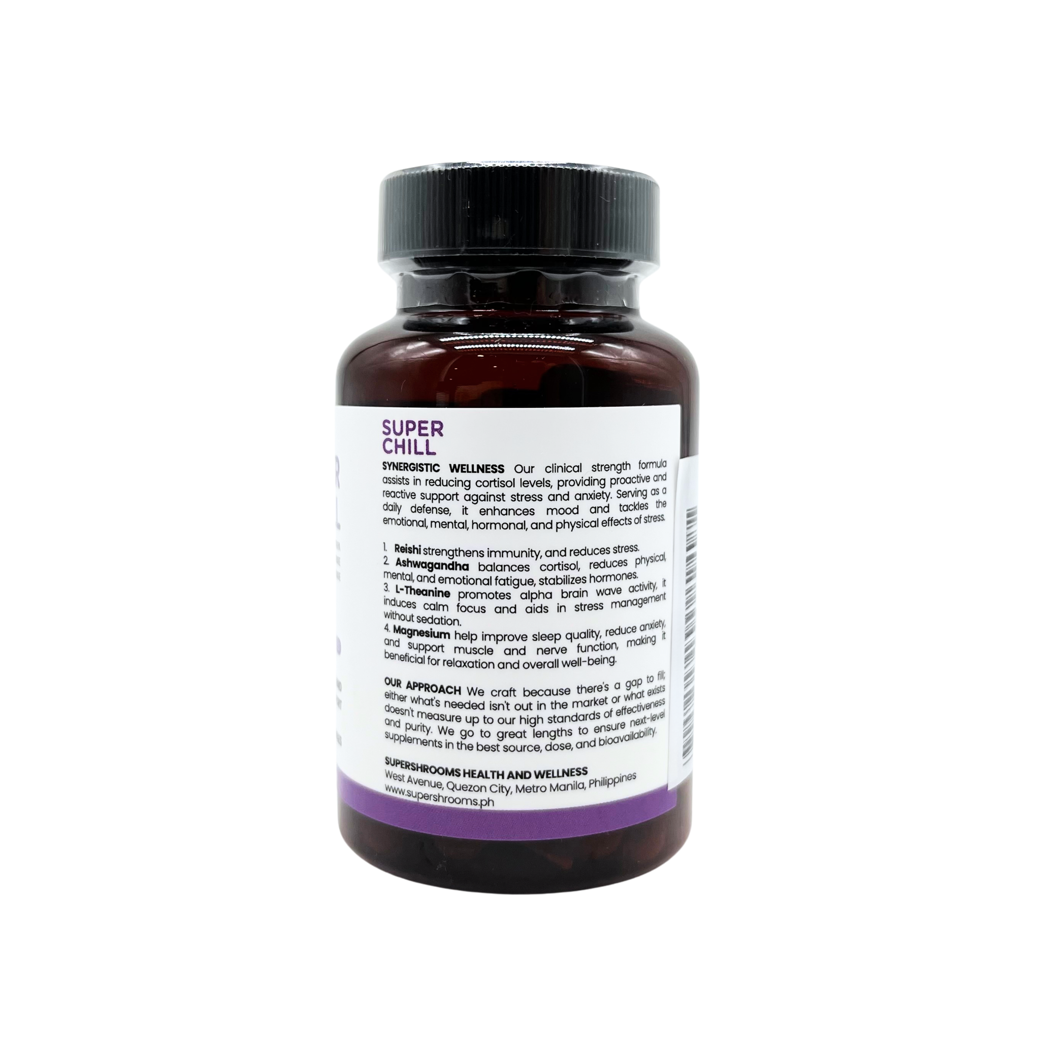 Find your calm with Supershrooms - Super Chill 4in1 capsules, designed to help your body manage chronic stress and anxiety. Made with Wild Reishi, Ashwagandha, Saffron, and L-Theanine, it promotes relaxation, and supports mood balance.