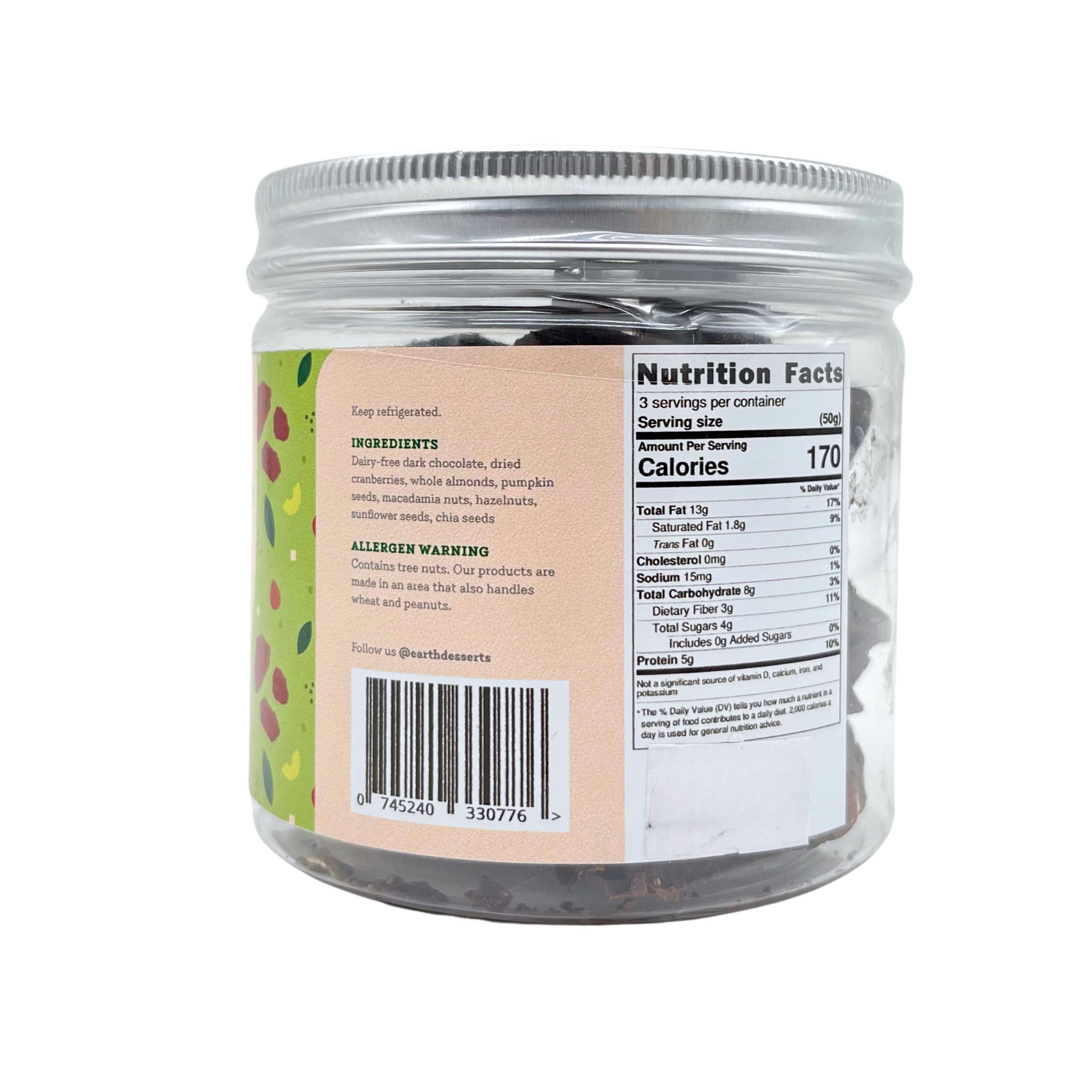 Ingredients: Dairy-free dark chocolate, dried cranberries, whole almonds, pumpkin seeds, macadamia nuts, hazelnuts, sunflower seeds, chia seeds