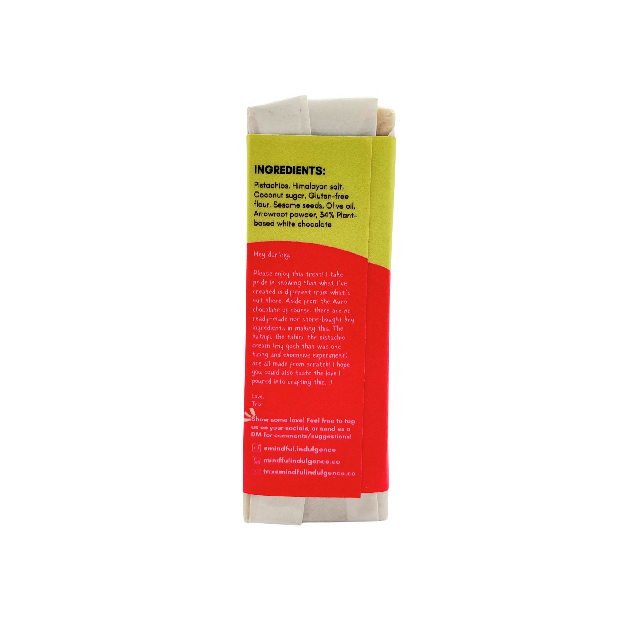 Ingredients: Pistachios, Himalayan salt, coconut sugar, gluten-free flour, sesame seeds, olive oil, arrowroot powder, 34% plant-based white chocolate