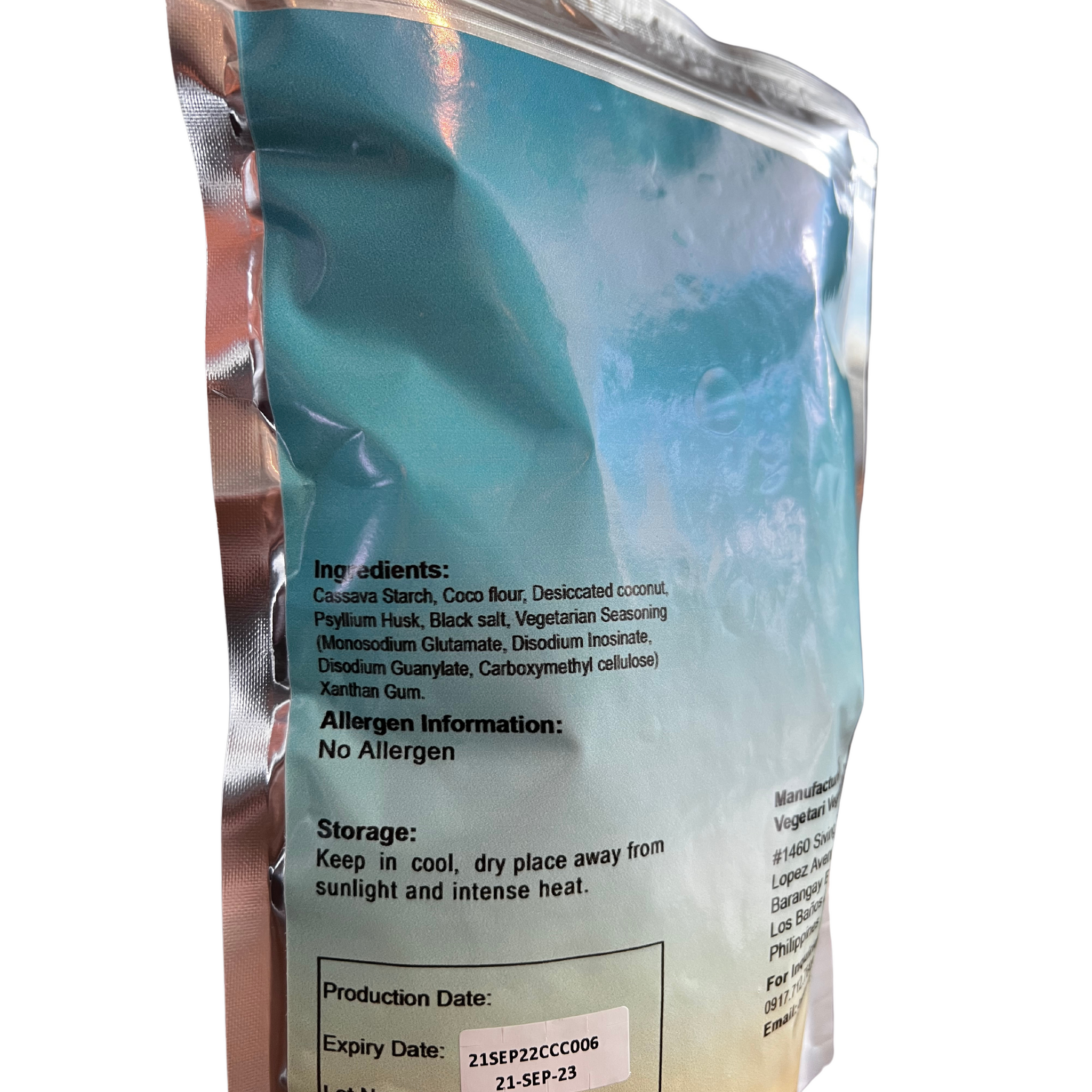 Ingredients: Cassava Starch, Coco Flour, Desiccated coconut, Psyllium Husk, Black Salt, Vegetarian Seasoning (Monosodium Glutamate, Disodium Inosinate, Disodium Guanylate, Carboxymethyl Cellulose) Xanthan Gum