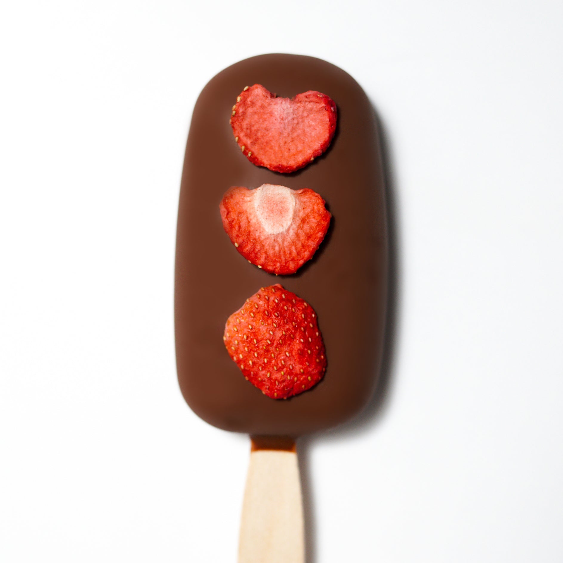A sweet and tart vegan ice cream blended with roasted strawberries covered in thick Auro 77% single origin dark chocolate topped with freeze dried strawberries.