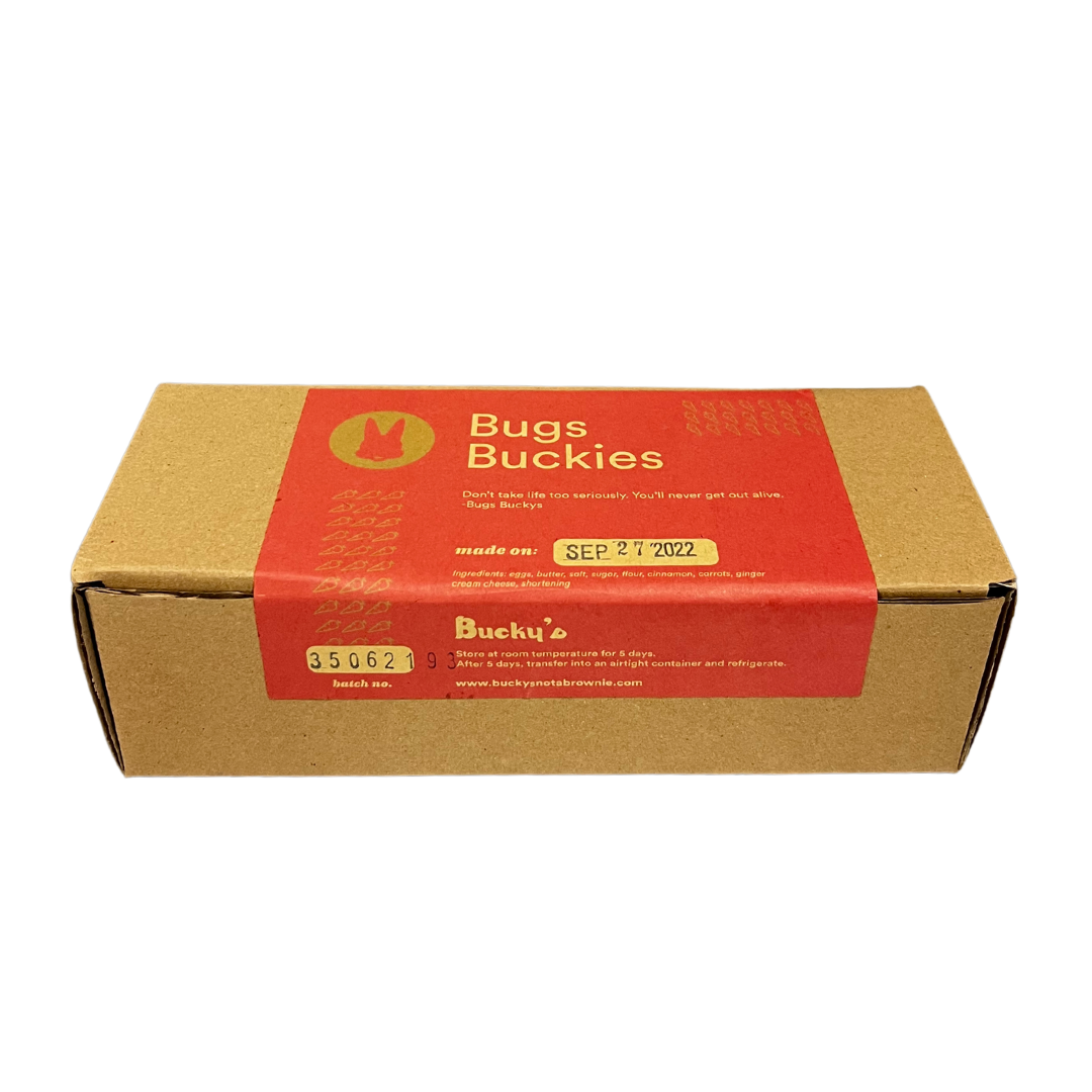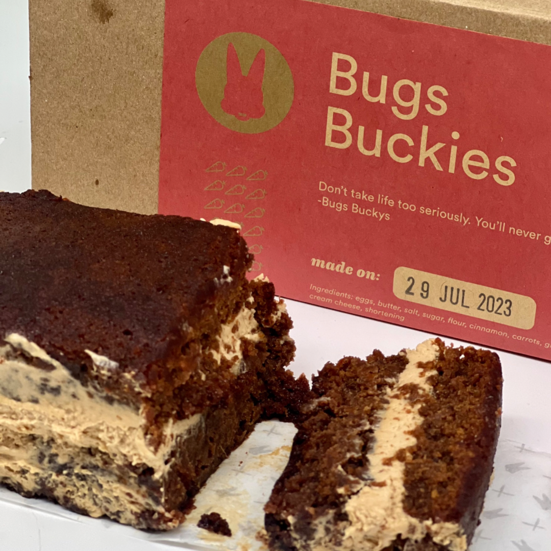 Carrot cake done ala Bucky! The Buckys come in a slab form in a box. Each box comes with a handmade knife made by a small community in Leyte. Slice to your heart's desire!