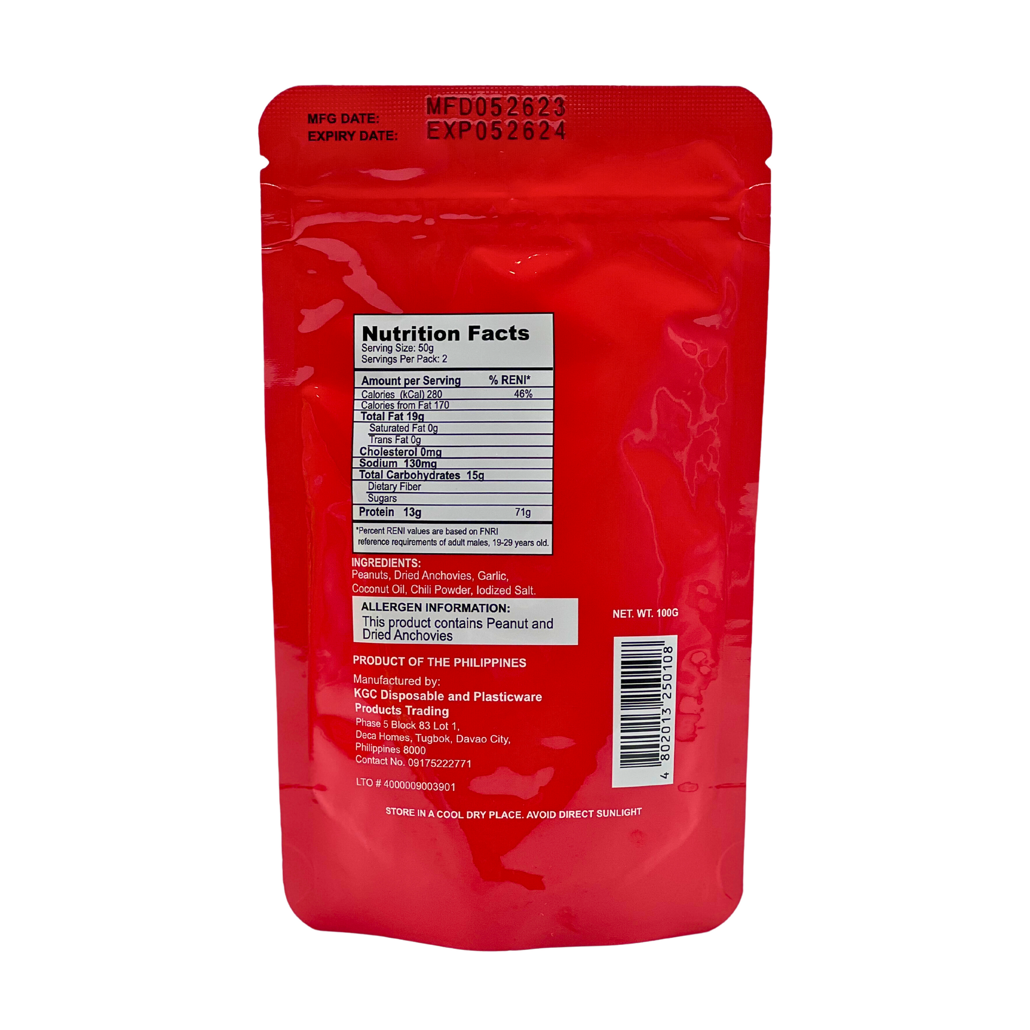 Ingredients: Peanuts, Dried Anchovies, Garlic, Coconut Oil, Chili Powder and Iodized Salt.