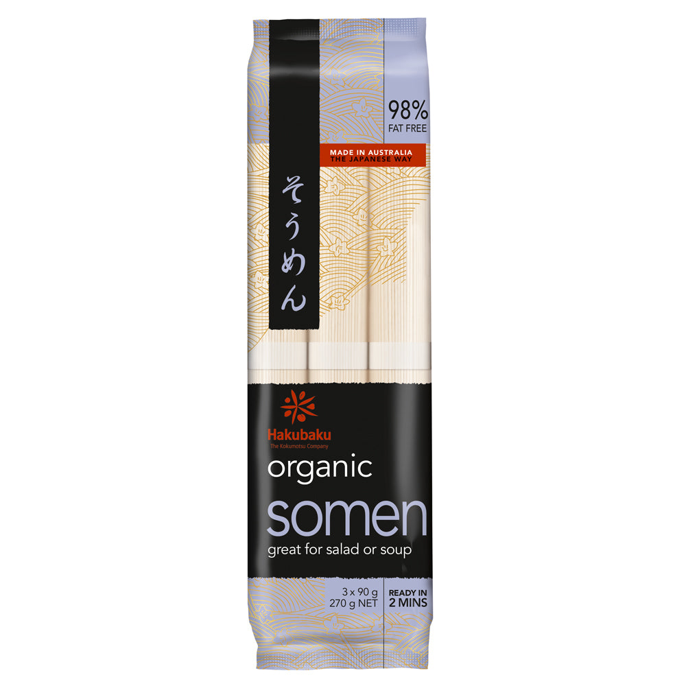 Somen is the thinnest of all Japanese noodles. They are made from a hard organic wheat that gives a different texture and bite. Somen can be added to stir fries and soups, including the famous Vietnamese noodle soup, pho. During the hot summer months it is even served in iced water with a dipping sauce. This is 98% fat free, and is certified organic, Kosher, and Halal.