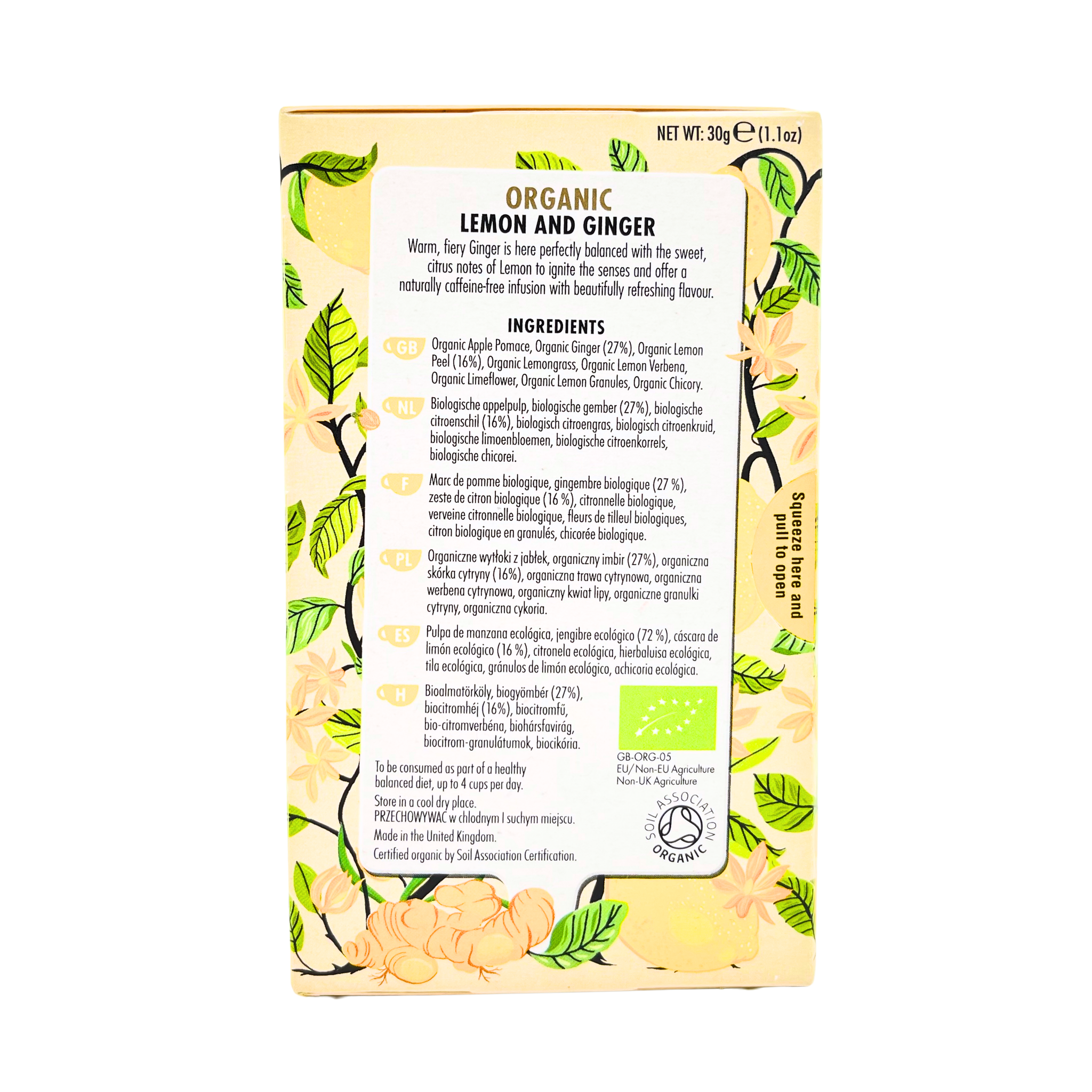 Ingredients: Organic Apple Pomance, Organic Ginger (27%), Organic Lemon Peel (16%), Organic Lemongrass, Organic Lemon Verbena, Organic Limeflower, Organic Lemon Granules, Organic Chicory.
