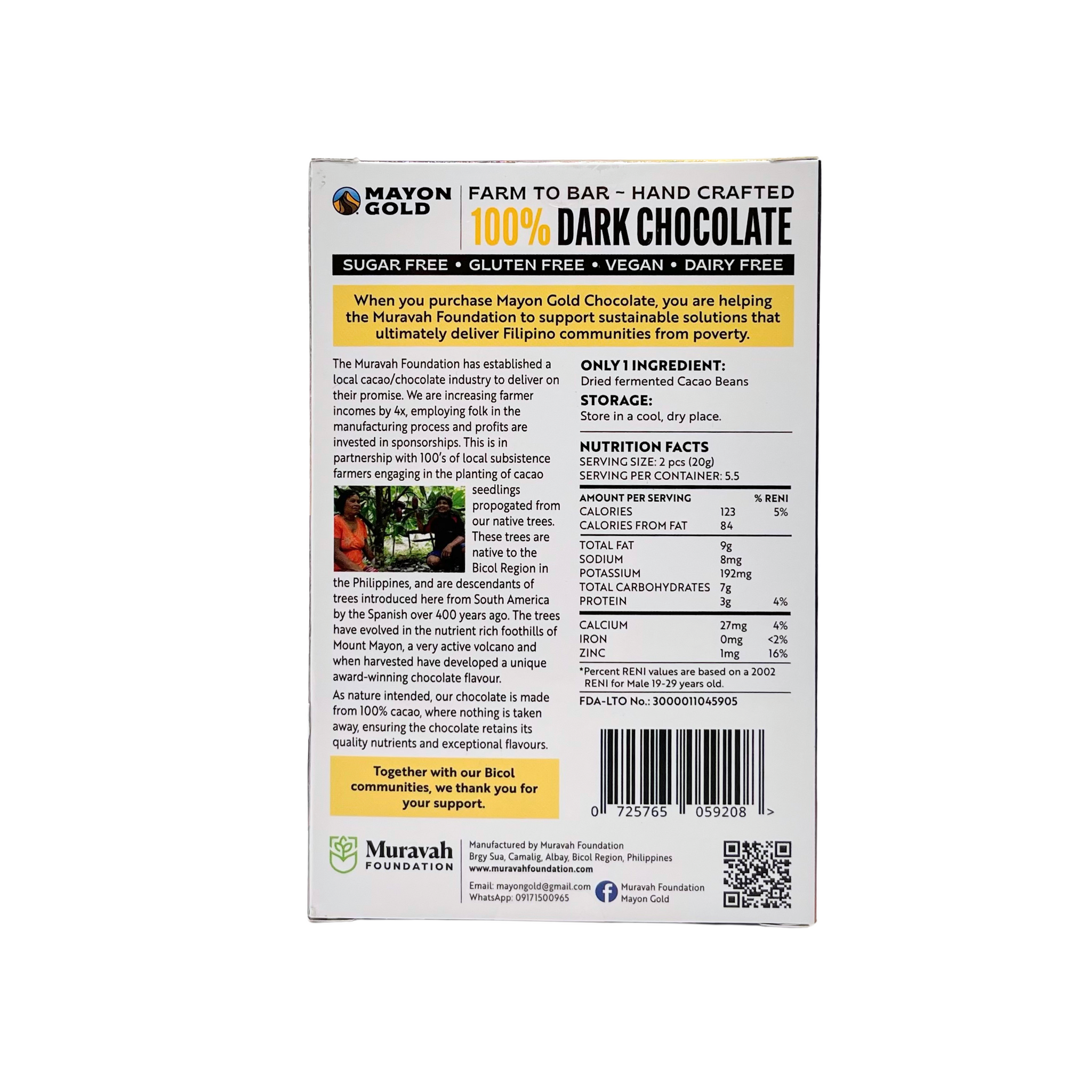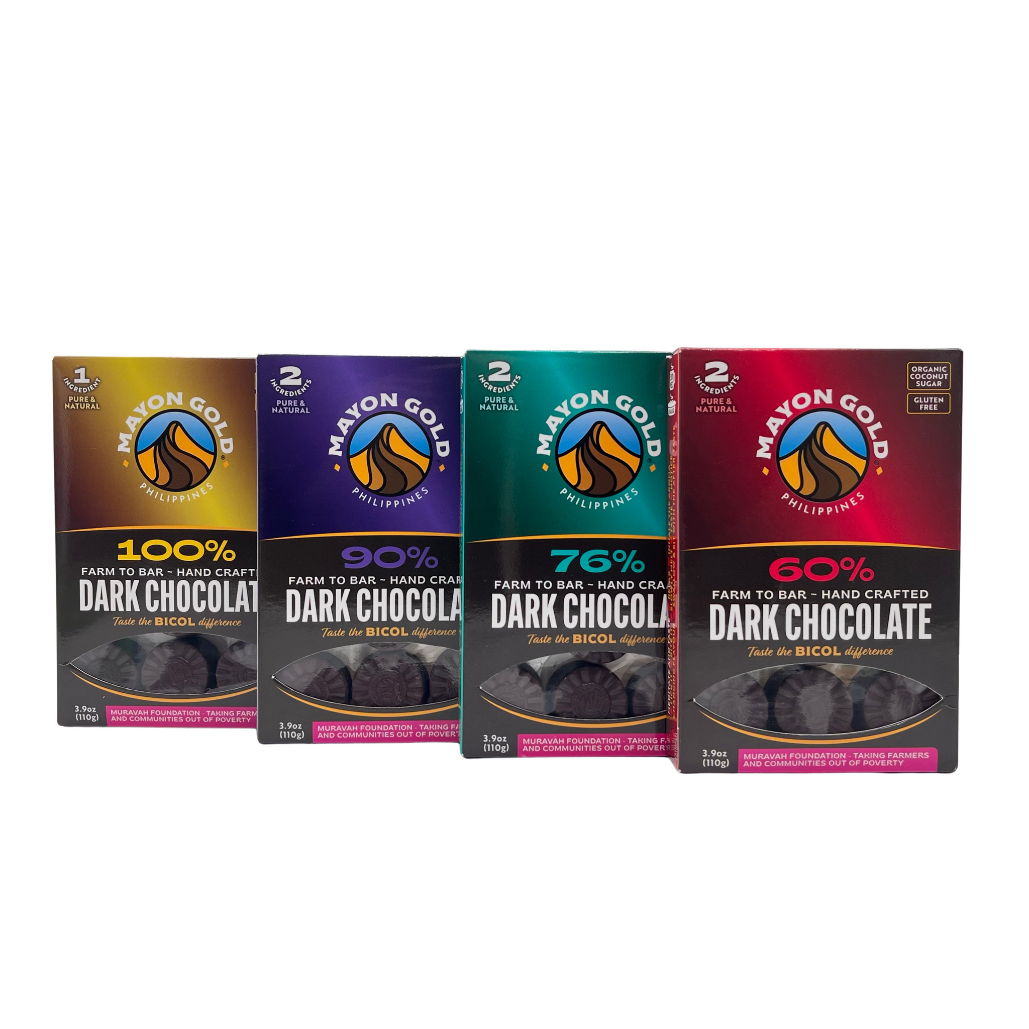 Mayon Gold Pure & Natural Dark Chocolate is a celebration of purity, intensity, and purpose. Made with wild-grown cacao, sweetened only with organic coconut sugar, and available in a full spectrum of cacao levels—from bold and intense to smooth and approachable.