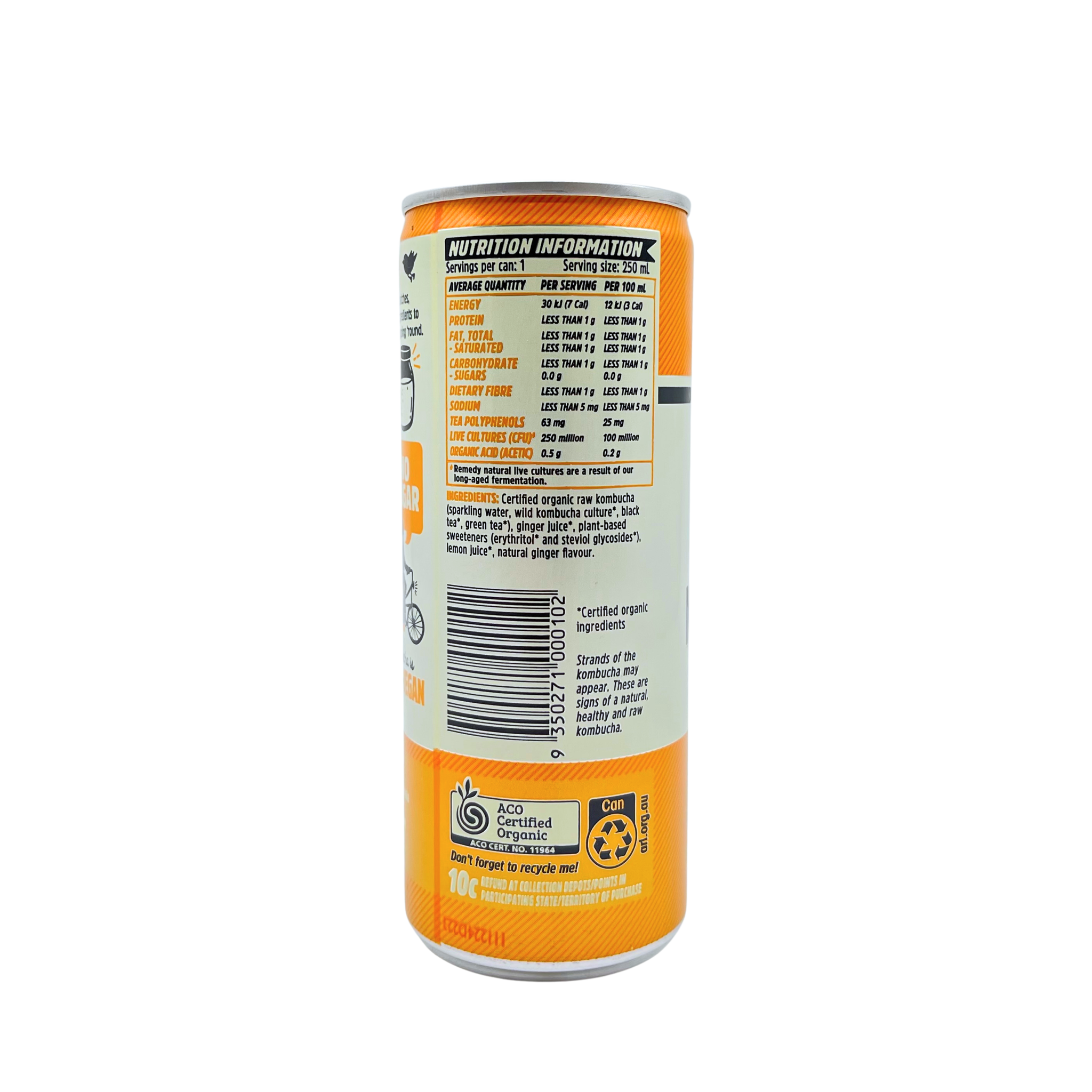 Ingredients: Certified organic raw kombucha (sparkling water, wild kombucha culture, black tea, green tea), ginger juice, natural sweeteners (erythritol and steviol glycosides), lemon juice, natural ginger flavor